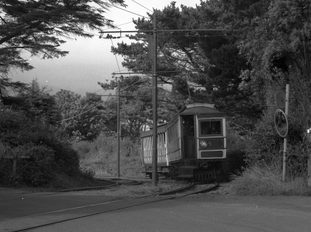 Car No.5 leads 1930-built Trailer No.44 up to the stop at Baldrine on the 26th of August 1990. The sighting on the crossing can be bad for drivers of both road and rail, so caution is always exercised here. © Colin Clifton