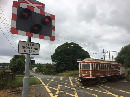 Car No.5 and Trailer No.44 head north over the level crossing with a Ramsey service on the 25th of July 2016. © Alex Fairlie
