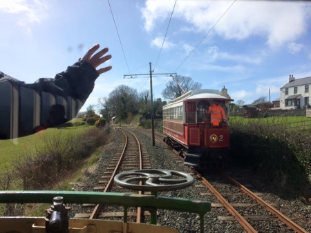 Car No.16 passes Car No.2 just outside Ballabeg on the 27th of March 2016 with the motormen giving a cheery wave to each other. Both cars were working single-motor Laxey specials as part of the March 2016 ‘Rush Hour’ event. © Alex Fairlie
