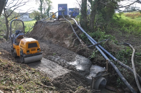 Ballabeg on the 20th of October 2012, with repairs being carried out to a severe slip which occurred a week previously. Following torrential rain, a culvert beneath the line and embankment partially collapsed. The railway’s response was swift and repairs began on Monday. In the picture, taken looking towards Derby Castle, the formation of the line can be seen near the middle top and the new culvert to the lower right. © Andrew Scarffe