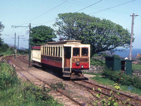 Car No.20 and Trailer No.57 pass the stop at Ballafayle Corteens with the 16:00 Ramsey-Derby Castle on the 5th of June 1969. Note the waiting shelter, erected by locals rather than the M.E.R Co itself. © Richard Pryke