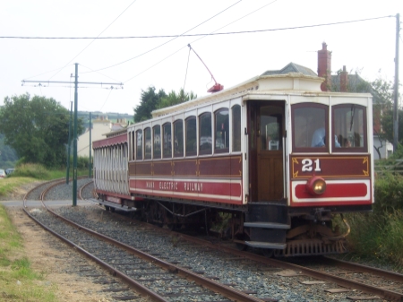 Car No.21 and Trailer No.41 hurry a service northbound past Ballagawne on the 24th of July 2008. During this period the Derby Castle-Laxey section was the only section ran as double track, with above Laxey ran as single track with a passing loop at Ballaskeig. © David Martin