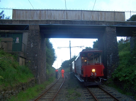 A special trip ran by TLP Tours on the evening of the 4th of August 2010 saw the unusual combination of Car No.33/Trailer No.51/Trailer No.59 pause for a photo-stop underneath the bridge at Ballagorry. The substation, installed in 1989, is viewable to the left. © David Martin