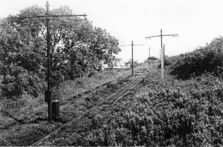 The former exchange siding at Ballajora Quarry to the right are heavily overgrown in this view looking towards Laxey and Derby Castle in the 1940s. © Website Collection