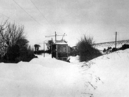 Stuck! A particlarly bad Winter for the entire Isle of Man occurred in 1937, which saw the whole island nearly grind to a halt. Car No.9 has been the victim of this drift at Ballameanagh – the car was specially fitted with a snowplough during the Winter months for these duties. © Travel Lens Photographic