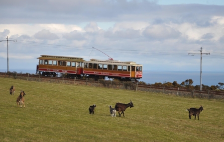 Car No.19 and Trailer No.58 head downgrade after the Ballaragh stop with the 12:40 Ramsey-Derby Castle on the 17th of March 2013. An audience of wild goats admires the Winter Saloon/Winter Trailer pairing! © Andrew Scarffe