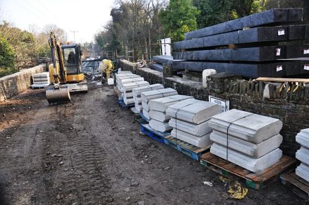 Replacement coping stones for the walls between the viaduct and level crossing, made in the original style, awaiting placement. © Andrew Scarffe