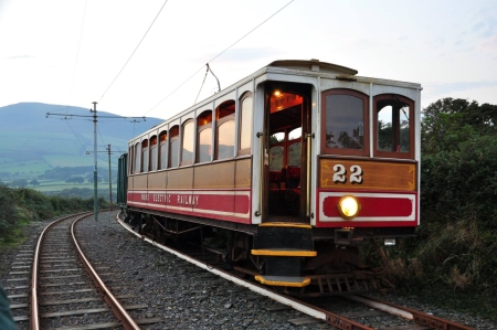 Car No.22 and Van No.16 working a evening private hire in Autumn 2016, paused for a photograph with North Barrule to the rear. © Andrew Scarffe