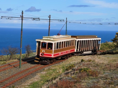 Blue skies and sea as Car No.21 and Trailer No.48 round the curve at Bulgham, working the 16:10 Derby Castle-Ramsey on the 29th of March 2015. © Andrew Scarffe