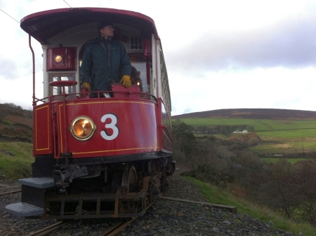 ‘Car No.3’ (a disguised Car No.2) pauses for a photostop at Bulgham Head on the 2nd of November 2013, while the rare combination of Car No.21 and Trailer No.60 pass under the shadow of Slieau Ruy in the background. © Alex Fairlie
