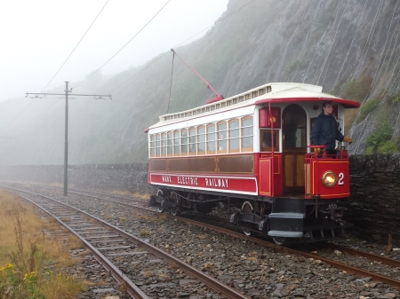 Car No.2 running single-motor pauses for a photo-stop at Bulgham on the 1st of August 2014 whilst operating the ‘Crossover Crossbench’ charity railtour. The car has just reversed using the crossover just south of here at Ballaragh and was heading for Ramsey. © Chris Rowe