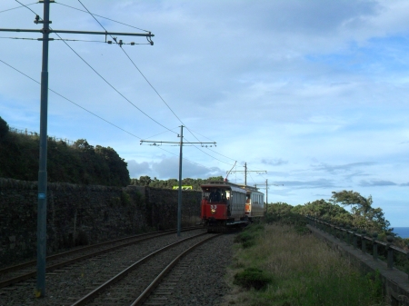 Car No.33 and Trailer No.57 arrive at the Bulgham Stop on the 29th of July 2012 with a working from Ramsey to Derby Castle. The combination was in use for the Manx Heritage Transport Festival intensive service day. © David Martin
