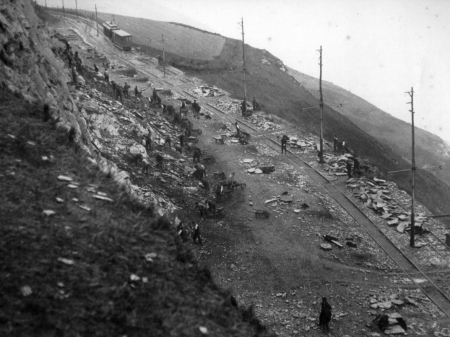 In this view from 1903 works are underway to move the formation of the railway back from the cliff face – A 14-18 series Car waits with a 1894-built Trailer in the distance, presumably on works duties as a single line is in operation through the worksite. © Website Collection