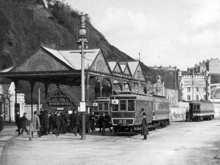Derby Castle in 1905 with two car sets waiting for passengers on the Groudle Siding and main departure road. Car No.4 waits to shunt onto the departure stop in the far distance. © Website Collection
