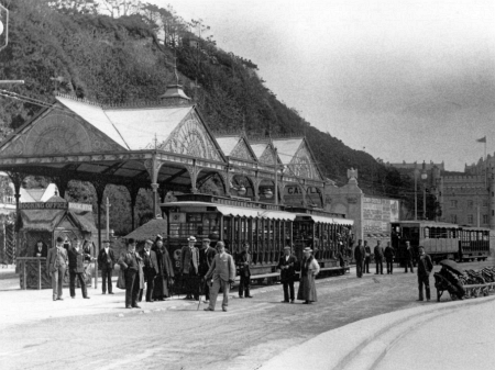 A posed photograph in 1899 at Derby Castle with a 1898-built 14-18 series Car towing a trailer of the same vintage, carrying its original ‘2x’ number – pre-rebuild into a motor car. A 10-13 series Car of 1895 stands behind waiting to shunt. By this time a interim booking office had been placed at the terminus. © iMuseum