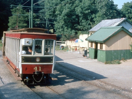 Trailer No.41 carrying the combined M.E.R/I.O.M.R crest of the ‘Isle of Man Railways’ corporate period tails a Ramsey service departing from Dhoon Glen in August 1984. © Crewcastrian
