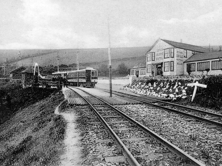 Car No.4 restarts a 1903-built Trailer away from Dhoon Glen in the mid 1900s. Note the cattle grid and gradient post in the foreground. © Website Collection