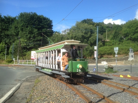 An unusual view of Car No.16 single-motor working wrong line through Dumbells Row on the ‘Green Wrong Road’ charity railtour on the 1st of August 2015. © David Martin