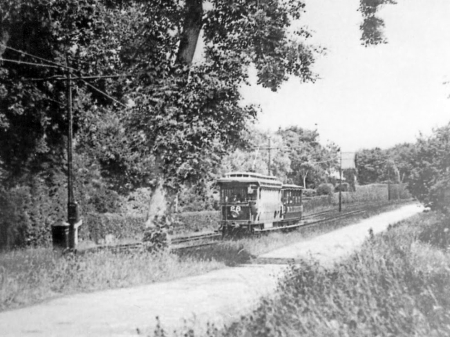 Car No.28 drifts downgrade with a 1894-built Trailer (either No.36 or No.37) from Eskadale during the 1930s – the condition of the adjacent highway is little more than a dirt road, contrasting with todays standard paved and marked type. © Travel Lens Photographic