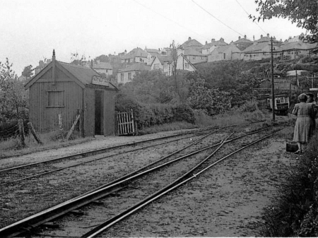 A view from the early 1950s, with passengers waiting opposite the shelter for the due northbound car (an enclosed example, just visible behind the southbound car) while a Crossbench hauling the heavyweight Trailer No.55 powers away to Derby Castle. © Travel Lens Photographic