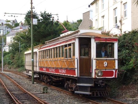 The colour clash combination of Car No.9 and Trailer No.48 arrive to pick up the photographer at Fairy Cottage on the 25th of July 2012. On this day the pair were working the Douglas 3 diagram – starting with this, the 11:10 Derby Castle to Laxey. © Alex Fairlie