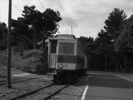 Car No.9 brakes to a stop at Groudle Old Road on the 26th of August 1985. The Car is wearing an inteperation of the ‘Douglas, Laxey and Ramsey Electric Railway’ livery, carried between 1898 and 1903. © Colin Clifton