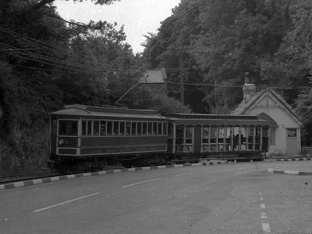Car No.5 and Trailer No.46 lead a Derby Castle bound service past the old Tollhouse into Groudle station on the 17th of June 1988. © Colin Clifton