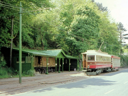 Car No.6 hauls a 1930-built Trailer past the steady brush of the painter inside the waiting shelter, during 1975. © Richard Pryke