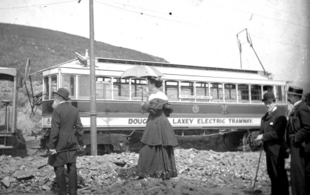 ‘One does believe one’s car is broken!’ Car No.5 in a spot of bother with its bow collectors at Howstrake in the mid-1890s, whilst hauling a 34-39 series Trailer on a short Derby Castle-Groudle working.© Website Collection