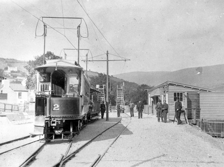 Car No.2 stands at the original Laxey terminus of 1894 shortly after opening with a 49-54 series Trailer. Visible in the distance are two tower wagons, presumably with staff tending to the overhead line. © Website Collection