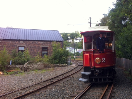 A wave from the motorman as he brings Car No.2 to a stand at the 1894 terminus site on the 28th of July 2014, otherwise known today as the ‘Laxey Car Shed’ stop. © Alex Fairlie