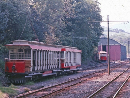 Cars No.26 and No.32 with Trailers No.56 and No.62 respectively at Laxey Car Shed waiting the call back to the station, no doubt for passengers who have either visited Laxey or had a ride on the Snaefell Mountain Railway and luncheon at the Summit in Spring 1971. © David Pirmann/Frank Hicks