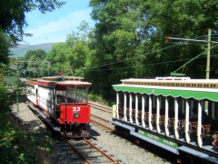 Car No.33 and Trailer No.46 are stabled in the car shed headshunt, while Car No.16 passes with a special for Laxey on the 30th of July 2011. © David Martin