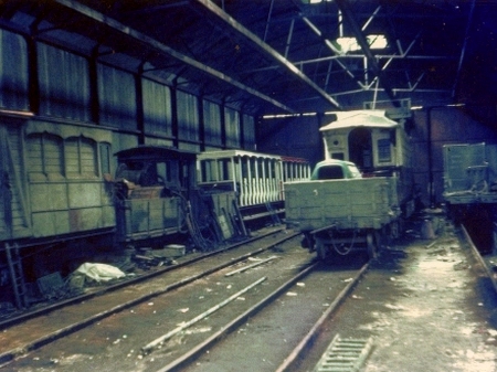 Inside Laxey Car Shed in the mid-1970s, with Freight Trailer No.26, Locomotive No.23, Trailer No.54 and Trailer No.36 on Road 4, Wagon No.1, Car No.2 and Tower Wagons on Road 2, and Weedkilling Wagon No.9 on Road 1. © Travel Lens Photographic