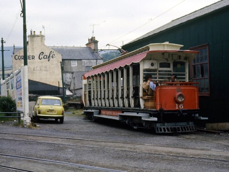 The crew of Car No.16 and Trailer No.42 converse while they wait further instructions from traffic in the Laxey Goods Shed siding, in 1975. Trailer No.52 is stabled in the background. © Richard Lomas