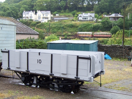Restored Open Wagon No.10 stands in the Laxey Blacksmiths Siding whilst Car No.21 and Trailer No.58 head past Little Egypt for Ramsey on the 18th of July 2011. © David Martin