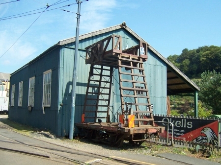 Laxey Goods Shed in July 2011, with Tower Wagon No.1 stabled outside. © David Martin