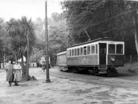 Laxey Station on the 24th of August 1954, with Car No.20 and 40 series Trailer paused waiting departure for Ramsey. © Website Collection