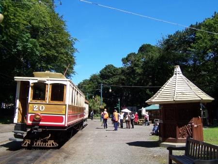 Car No.20 and Trailer No.43 load up passengers at Laxey on the 23rd of July 2011, working the 11:40 Ramsey-Derby Castle. © David Martin