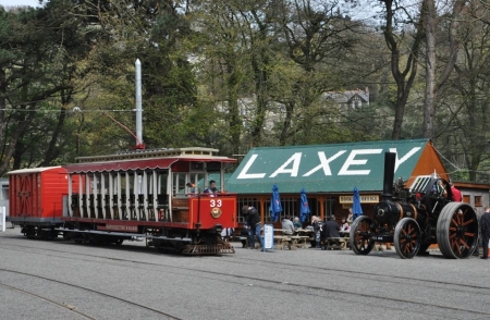 Car No.33 and Van No.4 pose next to a traction engine at Laxey on the 20th of April 2014. © Andrew Scarffe
