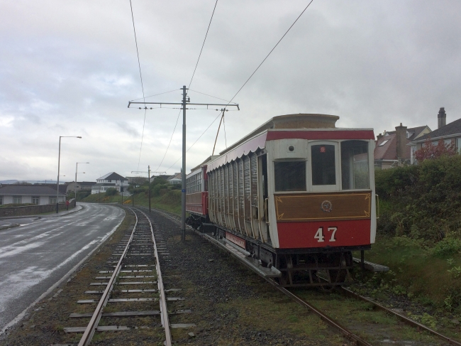 Car No.1 and Trailer No.47 depart Majestic working the 10:10 Ramsey to Derby Castle on the 16th of April 2017. © Alex Fairlie