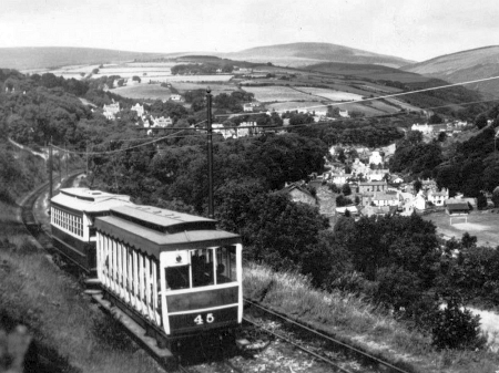 Car No.2 and Trailer No.45 start the decent into Laxey from Millers Crossing in the 1950s. Trailer No.45 had not long emerged from its total rebuild following a runaway accident at Ballaglass in August 1944. © Website Collection