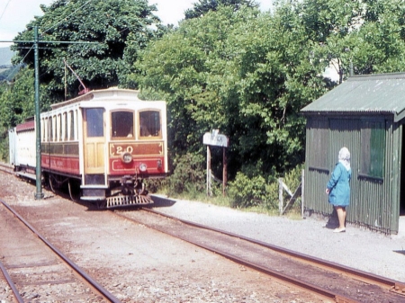 Car No.20 pulls into Minorca with Trailer No.48 and Van No.14 in tow on the 7th of July 1973. Note the stop nameboard erected by the waiting shelter. © Richard Pryke