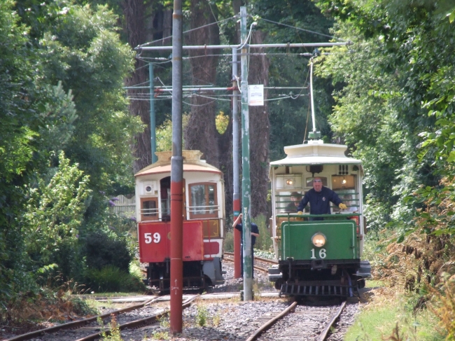 Viewed from Walpole Drive, Car No.2 and Trailer No.59 pause at the stop while Car No.16 and Trailer No.60 pass northbound with a service for Ramsey. © Alex Fairlie
