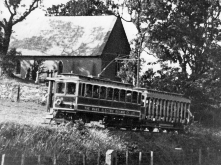 Car No.19 and a 40-series Trailer pass close to todays Queens Valley stop in the 1930s – today the scene has changed radically with the construction of an new housing estate and the levelling of the surrounding ground – the only indication of where this photograph was taken is the church, which survives today. © Website Collection