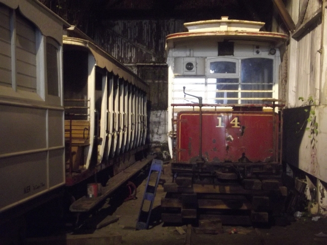 Stored items of rolling stock in the interior of Ramsey Car Shed on the 2nd of August 2014, including Cars No.14 and No.30, and Freight Trailer No.26. © Josh Haworth