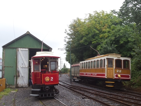 Car No.22 passes by Ramsey Car Shed with a 1899-built Trailer in tow whilst Car No.2 is about to depart with the ‘Crossover Crossbench’ railtour into Ramsey station on the 2nd of August 2014. © Chris Rowe