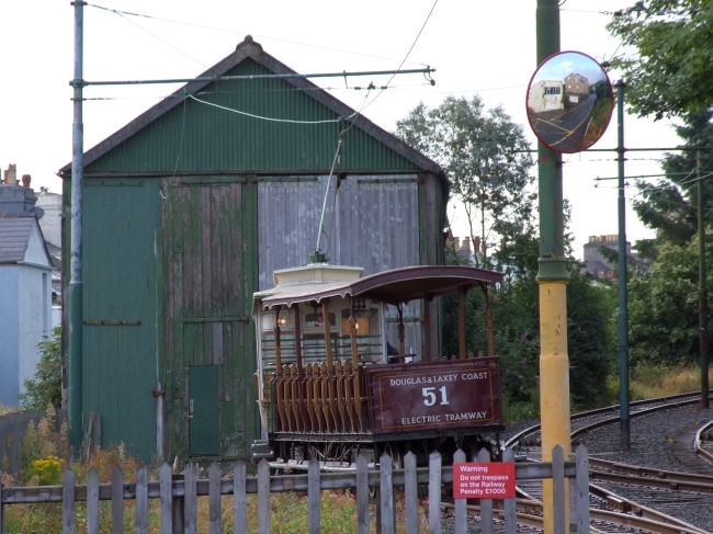 Ramsey Car Shed on the morning of the 24th of July 2013, with Car No.16 waiting to propel Trailer No.51 to the station to form the 10:10 to Derby Castle. © Alex Fairlie