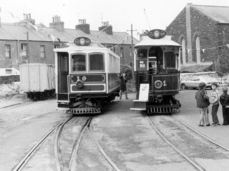 A scene from 1979 shows Van No.16 stored in the No.3 siding, alongside Car No.19 and No.1 in the 2 and 1 roads, both wearing the Centenary of Electric Traction headboards. © Website Collection