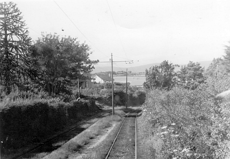 A ‘going-away’ view from the Sunnycott stop in 1957, taken from the rear of Trailer No.59. © Website Collection